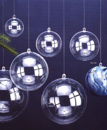 Sfere trasparenti in materiale acrilico per realizzare addobbi e decorazioni. Le sfere possono essere decorate con i colori per vetro e con altre tecniche quali il découpage. Inoltre possono essere aperte in due e riempite con fiori secchi, paillettes sagomate, ecc.